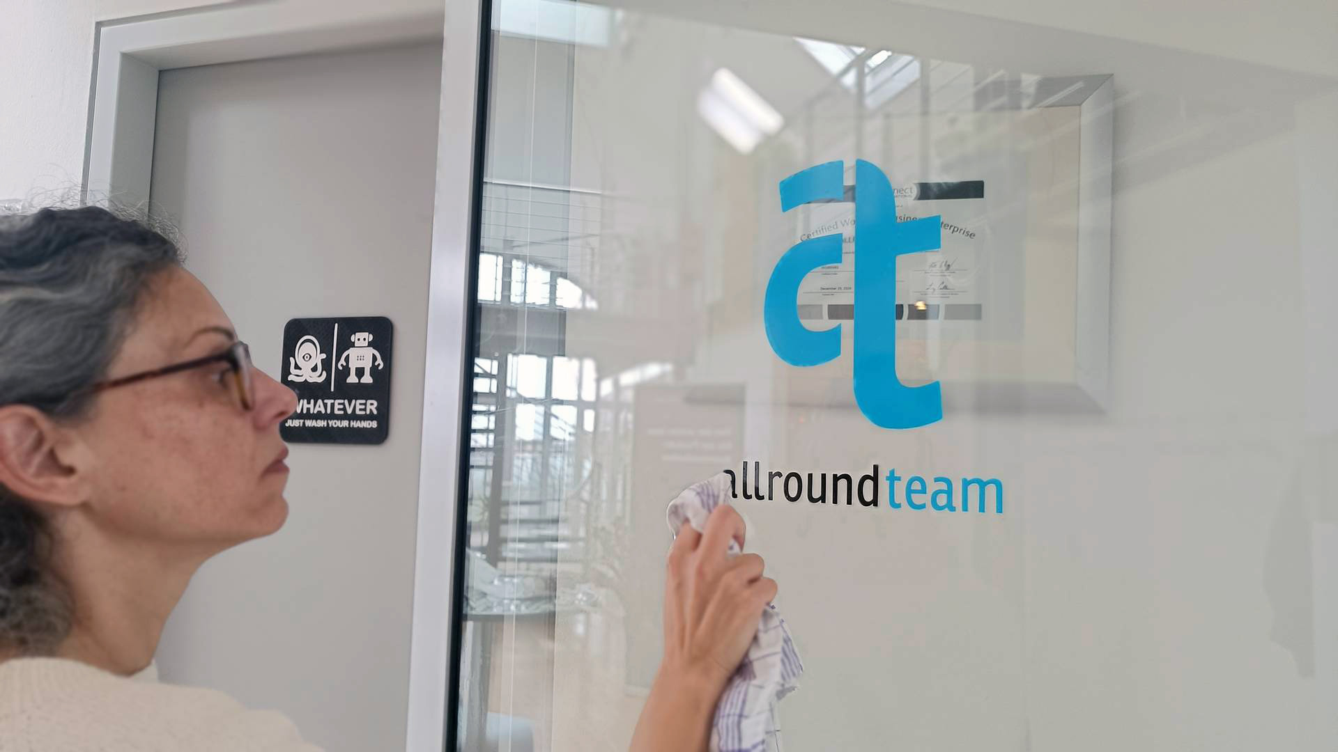 Die Glastüren in unserem Büro sind jetzt mit neuen Stickern versehen, die weit mehr sind als nur Dekoration: Sie veranschaulichen unsere Persönlichkeit, Werte und unser Markenbild.